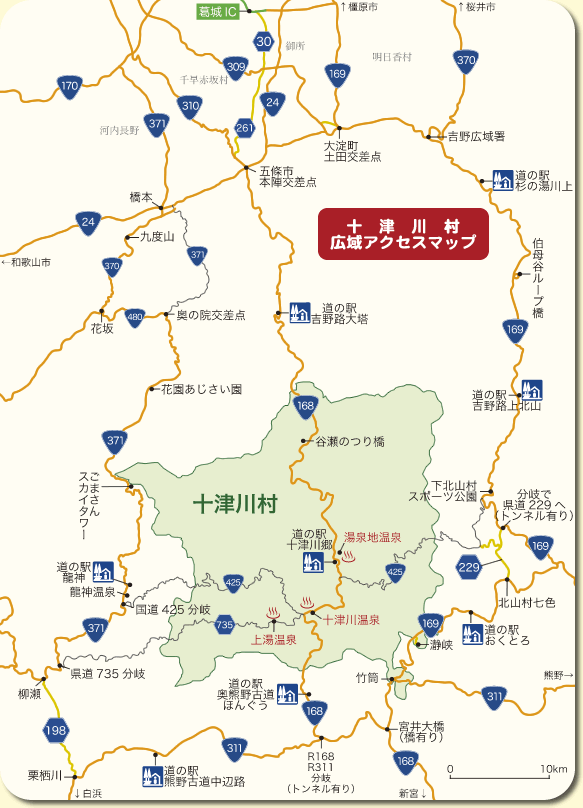 - 橋本市 → 九度山 → 花坂 → 奥の院交差点 → 花園あじさい園 → ごまさんスカイタワー → 道の駅龍神 → 国道425分岐 → 柳瀬 → 栗栖川 → 道の駅中辺路 → 国道168分岐 → 道の駅ほんぐう → 十津川温泉→湯泉地温泉(または上湯温泉)