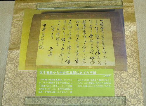 刀を贈られた際に坂本龍馬から中井庄五郎に宛てたであろうとされる手紙(写し)が展示(写真)されています。