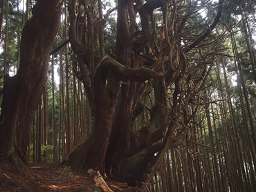 清流神納川にかかるつり橋を渡ると世界遺産「熊野参詣道小辺路」に入る三浦峠登山口があります。そこから少し登ったところにある吉村家跡防風林には樹齢500年、胴まわり4~8メートルにもなる大杉があり幹の太さとその迫力に圧倒されます。